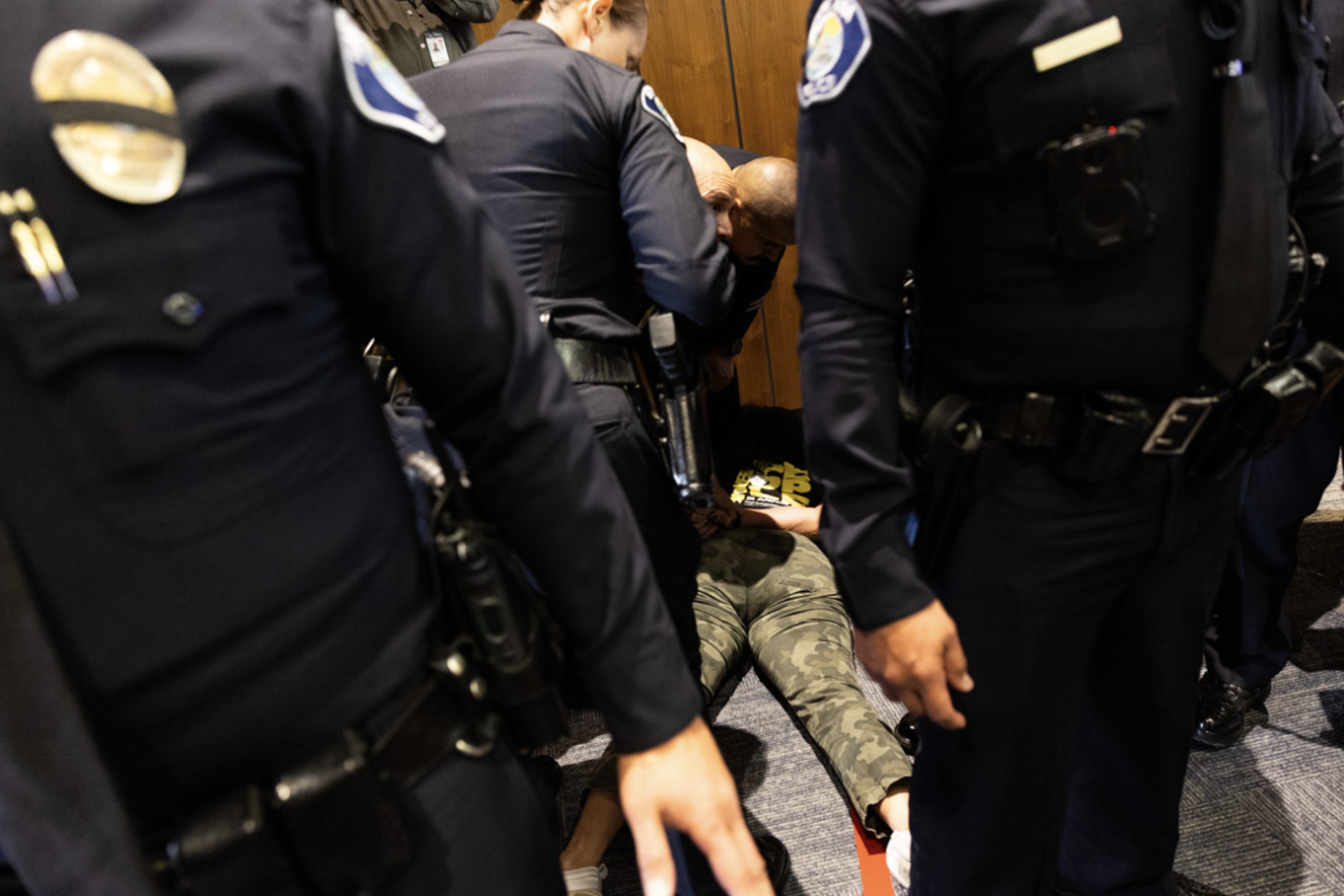 Screenshot 2025-06-18 at 1.39.09 PM A woman is handcuffed at the June 17 Santa Ana City Council meeting by a group of police officers