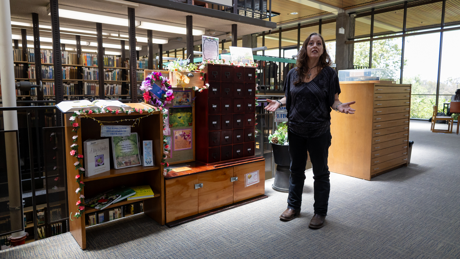 Cynthia Flores, library assistant for adult public services at Huntington Beach Public Library, stands in front of the seed library at the Huntington Beach Central Library. Credit: ERIKA TAYLOR, Voice of OC