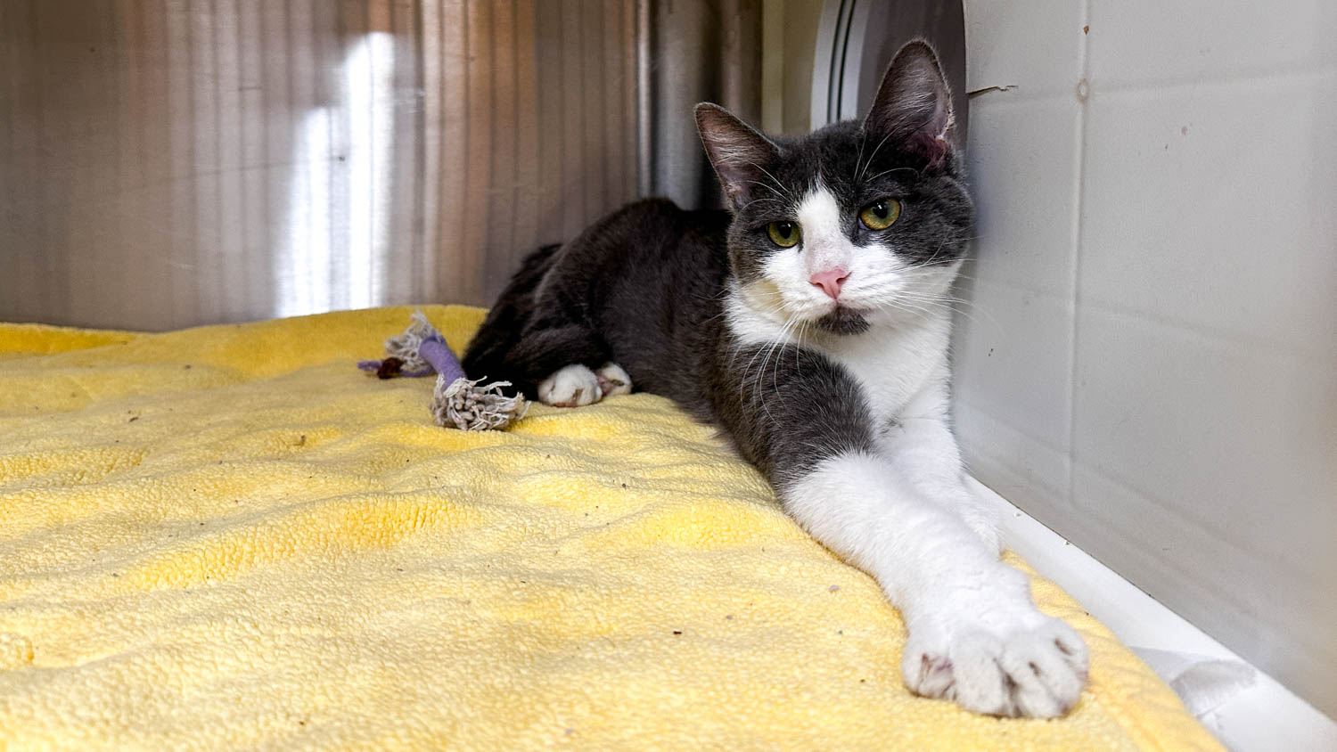 Lillian, a 6-month-old domestic shorthair cat, sits in her kennel at OC Animal Care in Tustin on July 29, 2025. Credit: ANGELINA HICKS, Voice of OC