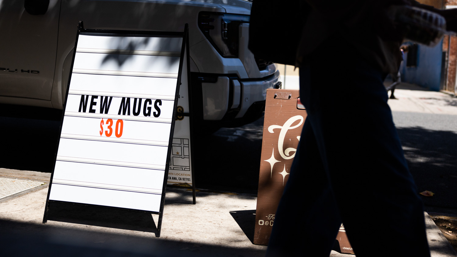 A-frame signs line a sidewalk in downtown Santa Ana. Credit: JULIE LEOPO, Voice of OC