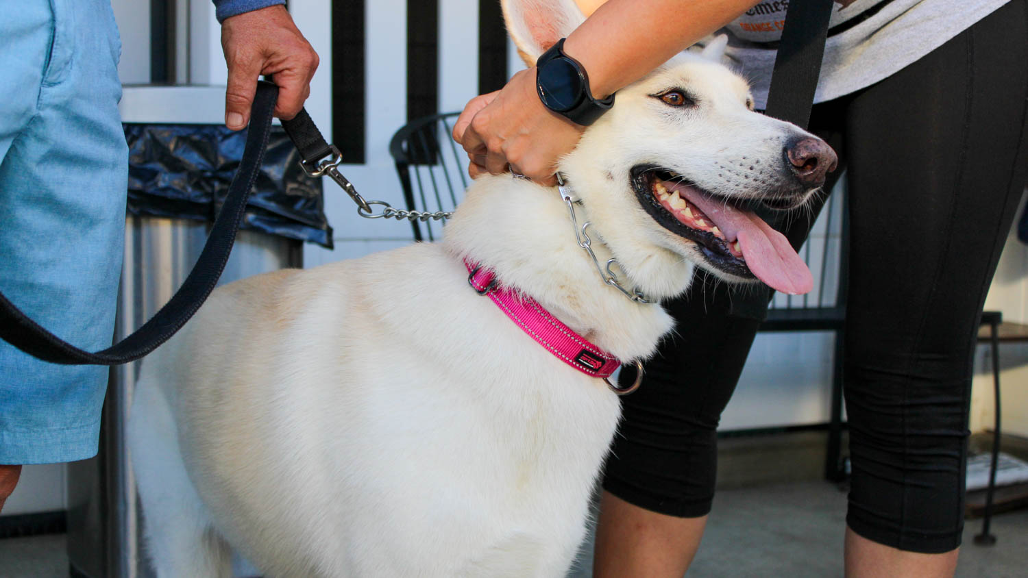 Volunteers with the German Shepherd Rescue of Orange County get Audrey the dog ready for an adventure walk in Newport Beach on Sept. 5, 2025. Audrey was adopted from a public shelter in 2020 and returned by the same family in 2024 before being pulled by the rescue. Credit: ANGELINA HICKS, Voice of OC
