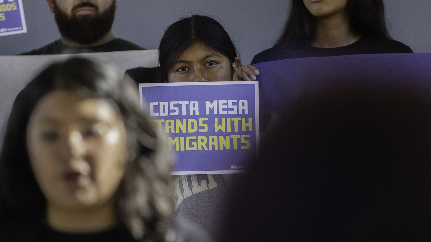 Community organizers from Resilience OC, Youth Organizing Group, Chamoy and the OC Rapid Response Network hold a press conference Tuesday, Sept. 9, 2025, outside the Costa Mesa City Council chambers, calling for immigrant and tenants’ rights ahead of the council meeting. Credit: JULIE LEOPO, Voice of OC