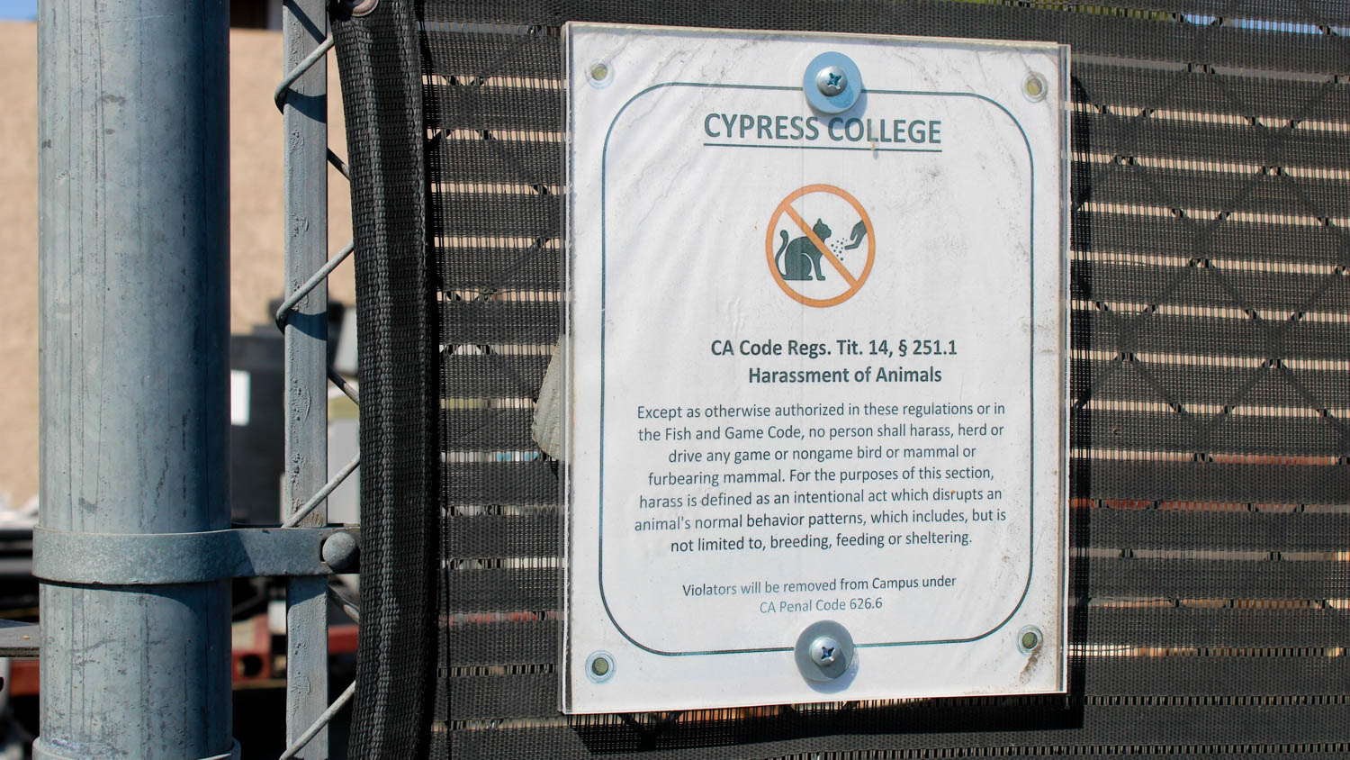 A sign at Cypress College directs people not to feed cats that live on campus on Sept. 12, 2025. Credit: ANGELINA HICKS, Voice of OC