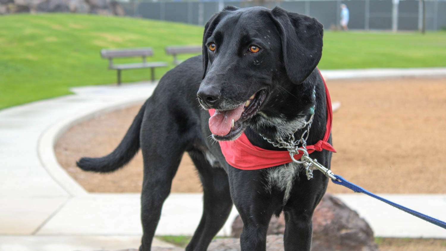 Oreo, a 2-year-old Labrador retriever mix, rests at an Anaheim park during a pack walk on Nov. 1, 2025. According to online descriptions, Oreo does best in a low-traffic home with older children and no small animals. He is already leash-trained and is available for adoption. He’s also available to foster. Credit: ANGELINA HICKS, Voice of OC