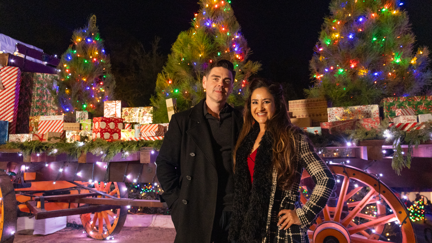 Don Worrel and Natalie Rodrigues pose for a photo in front of a decorated wagon inside Heritage Hill Historical Park during the Candlelight Walk event on Dec. 5, 2025. Credit: ERIKA TAYLOR, Voice of OC