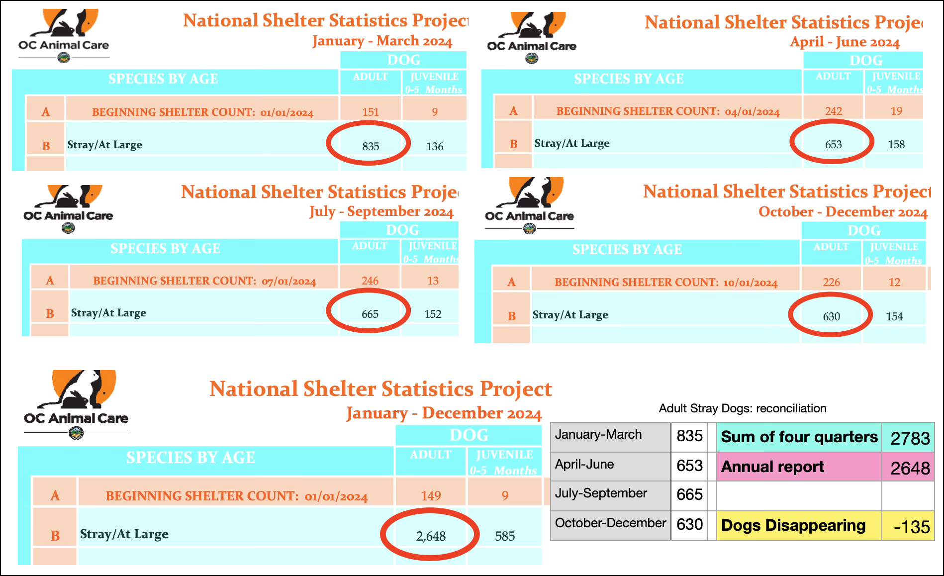 The shelter has animals magically vanishing or materializing in its published statistics. For 2024, the annual report shows a gap of 135 dogs compared to the four quarterly reports. That’s just one of many discrepancies. Credit: Images from OC Animal Care published statistics, assembled and tabulated by the author.