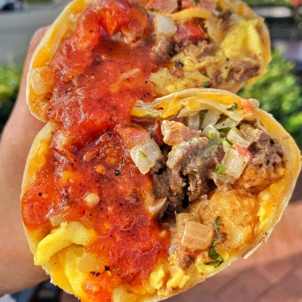 Burnt Crumbs-BurntZilla Brekkie Burrito Carne asada brekkie burrito from Burnt Crumbs/BurntZilla. Credit: Photo courtesy of Burnt Crumbs